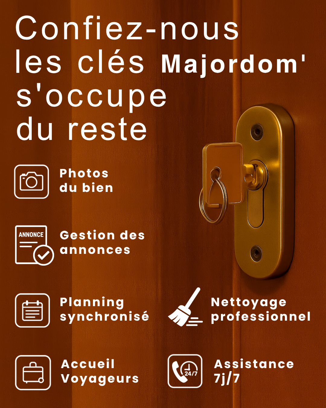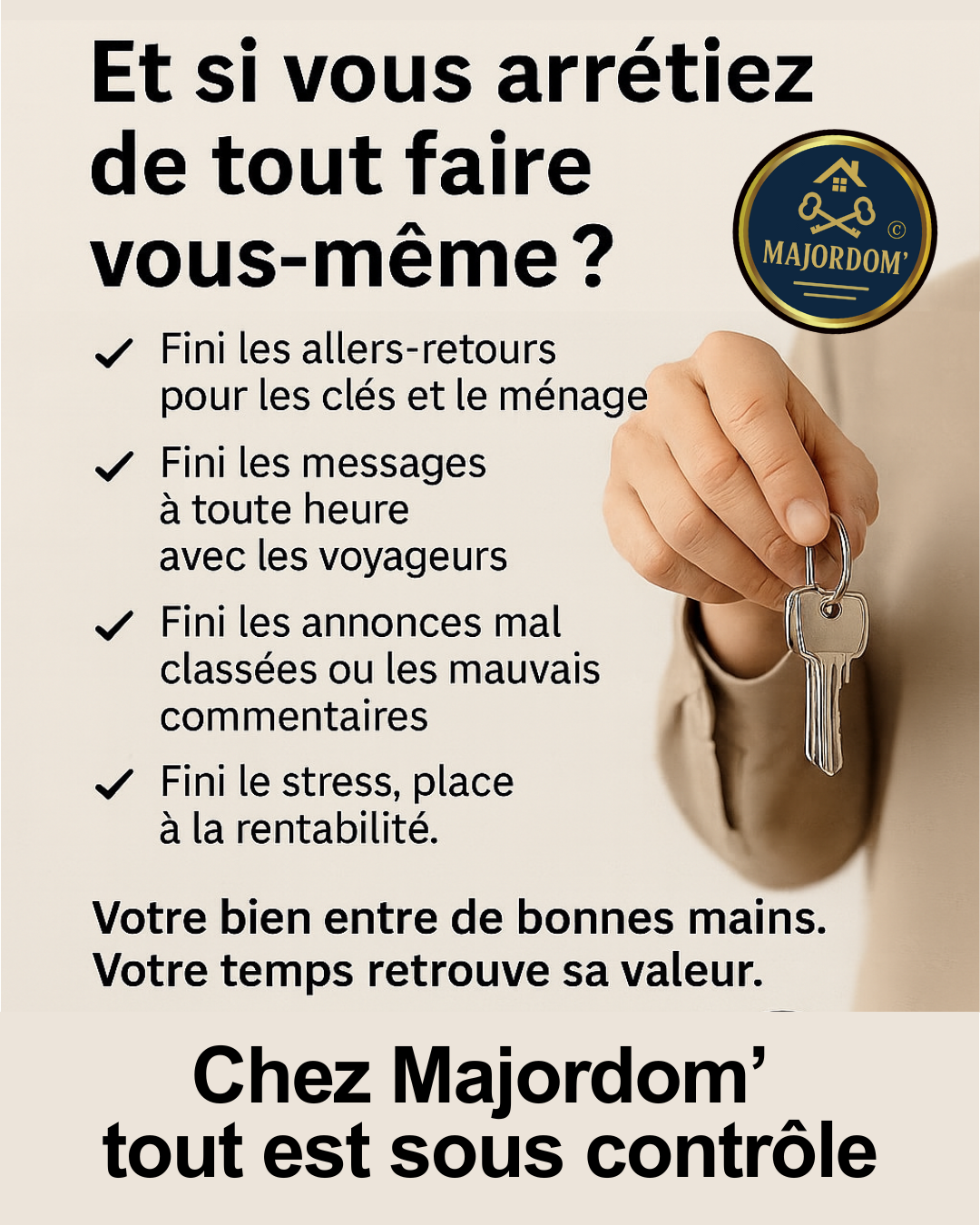 Et si vous arrêtiez de tout faire vous-même ? Entre les allers-retours, la gestion des voyageurs, le ménage, les messages à toute heure et les imprévus de dernière minute, votre bien locatif peut vite devenir une charge épuisante. Les annonces mal classées, les mauvais commentaires et la course contre le temps finissent par peser sur votre rentabilité… et sur votre tranquillité. Avec Majordom’, votre bien entre enfin de bonnes mains. Nos équipes prennent en charge l’intégralité de la gestion : accueil voyageurs, coordination, entretien, suivi qualité et communication. Votre temps retrouve sa valeur, et votre propriété révèle tout son potentiel.