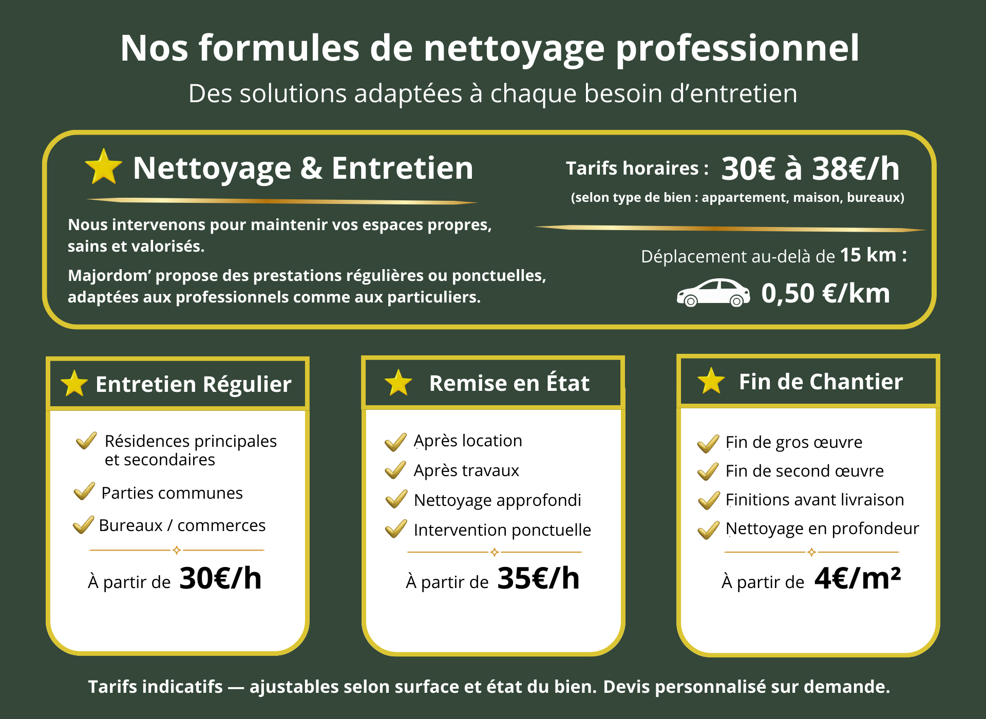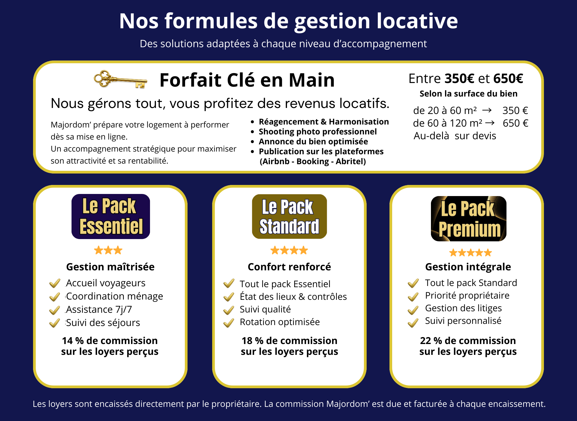 Commission Majordom’ : 14 % du montant des locations perçues par le propriétaire, quel que soit le canal de réservation (Airbnb, Booking, Abritel ou location directe).